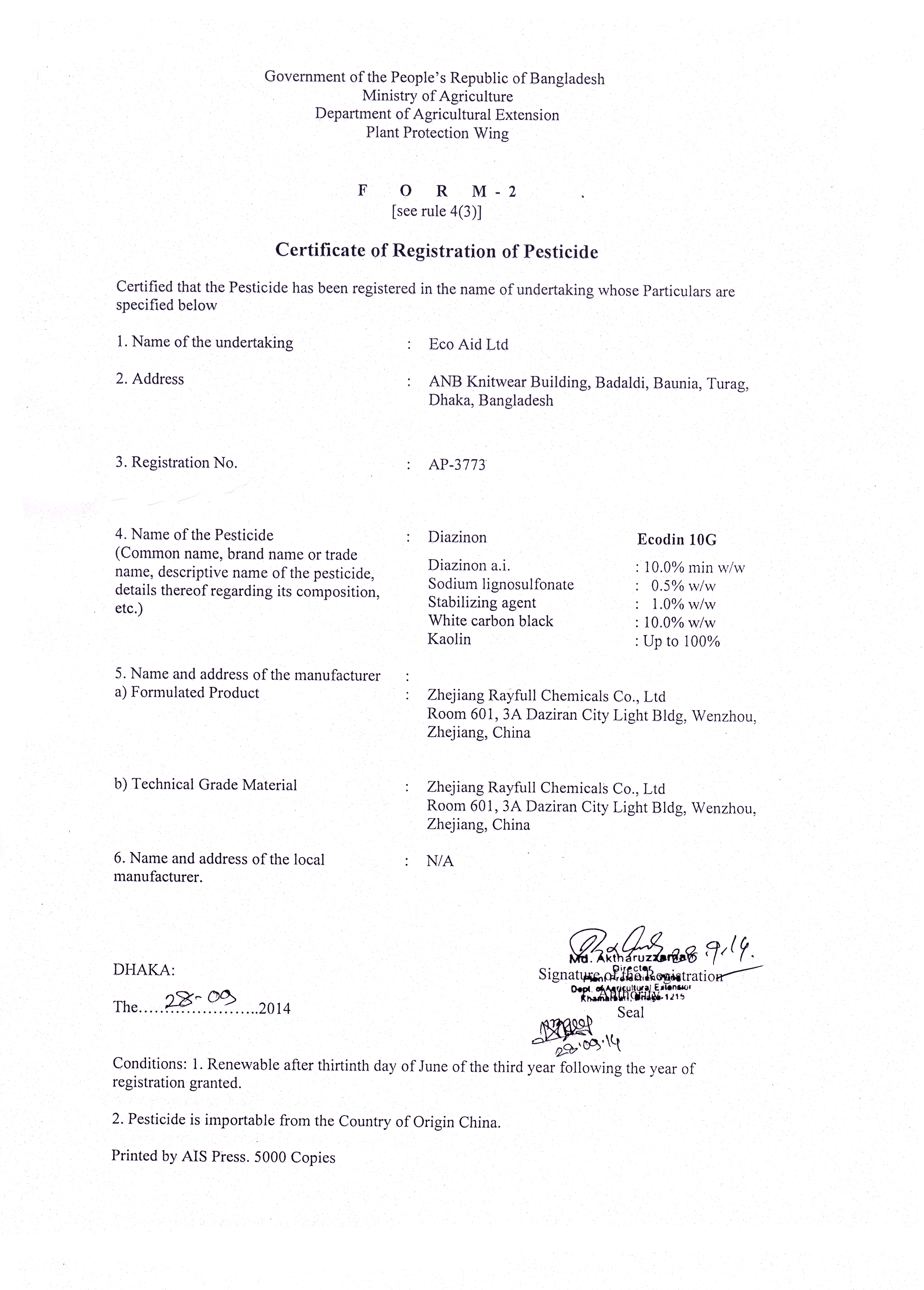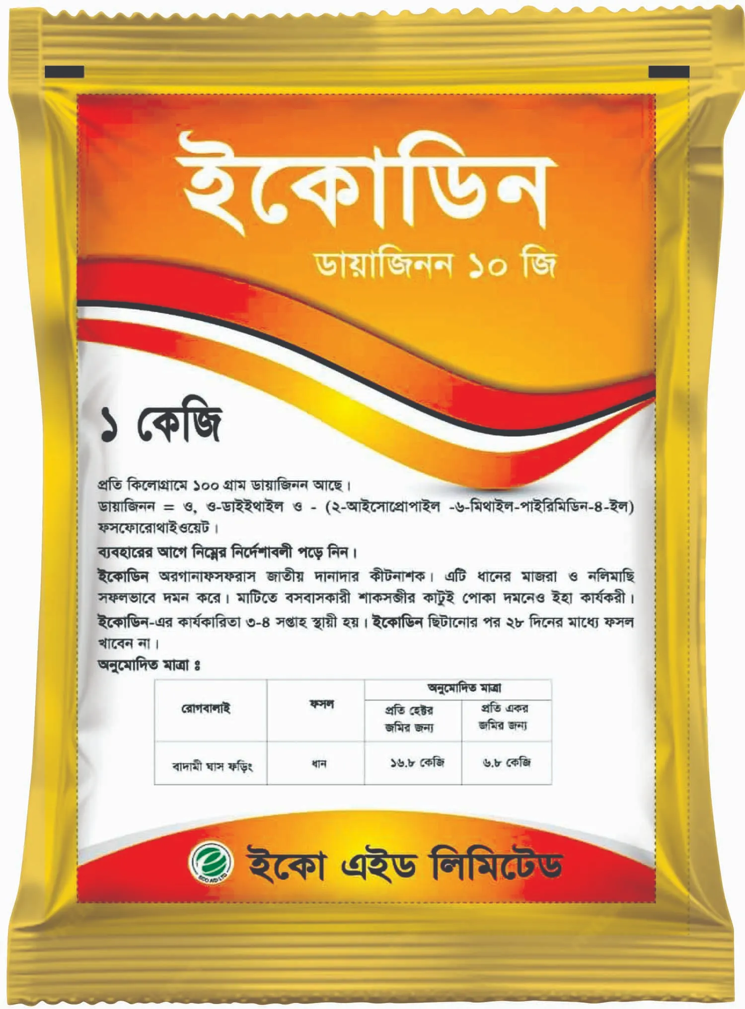Ecodin 10 G contain 100 gm Diazinon as active ingredient in 1 kilogram of granule. Diazinon is the common name of an organophosphorus insecticide used to control pest insects in soil, on ornamental plants and on fruit and vegetable field crops.